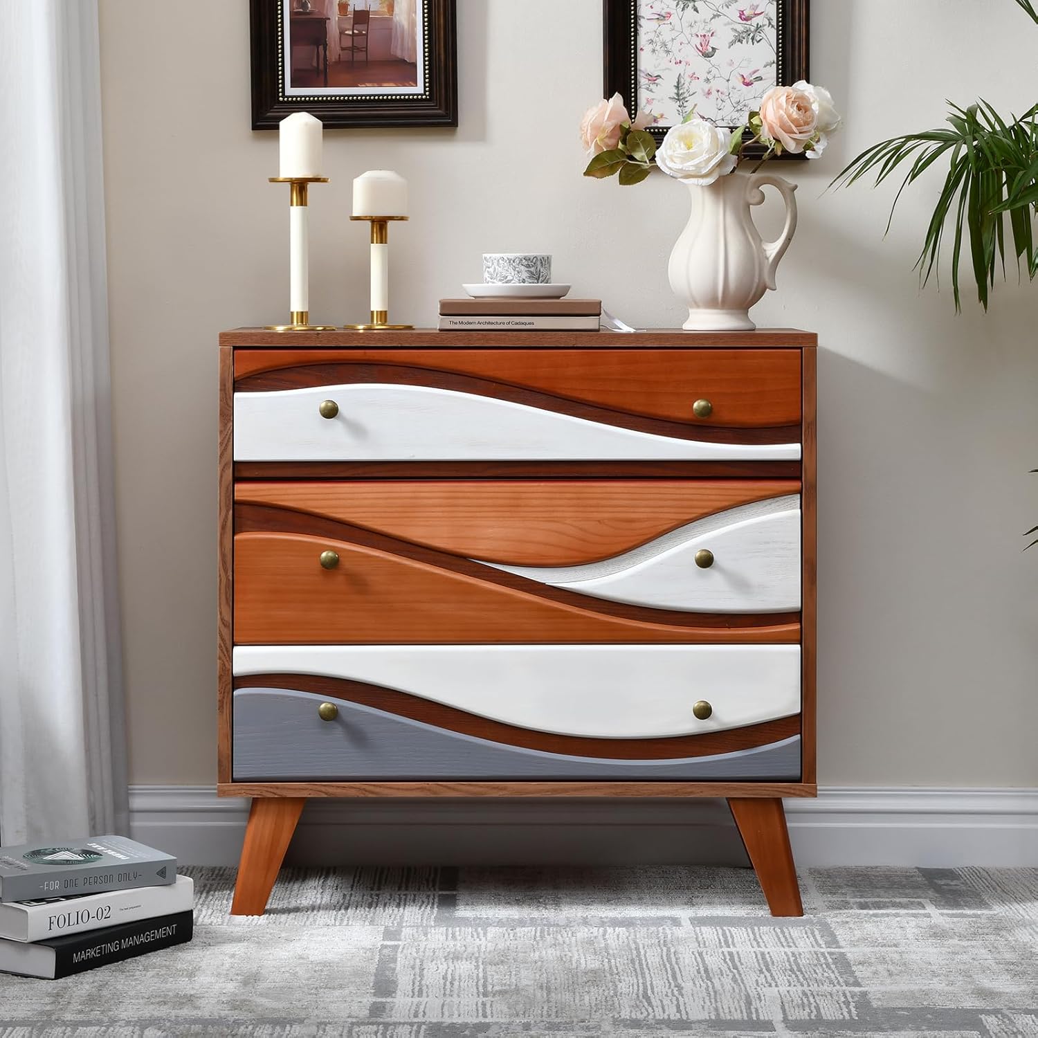 3-Drawer Dresser with Sculpted Wave Fronts, Tri-Color Drawer Design, Modern Chest of Drawers Storage Cabinet for Bedroom, Living Room, Hallway, or Office