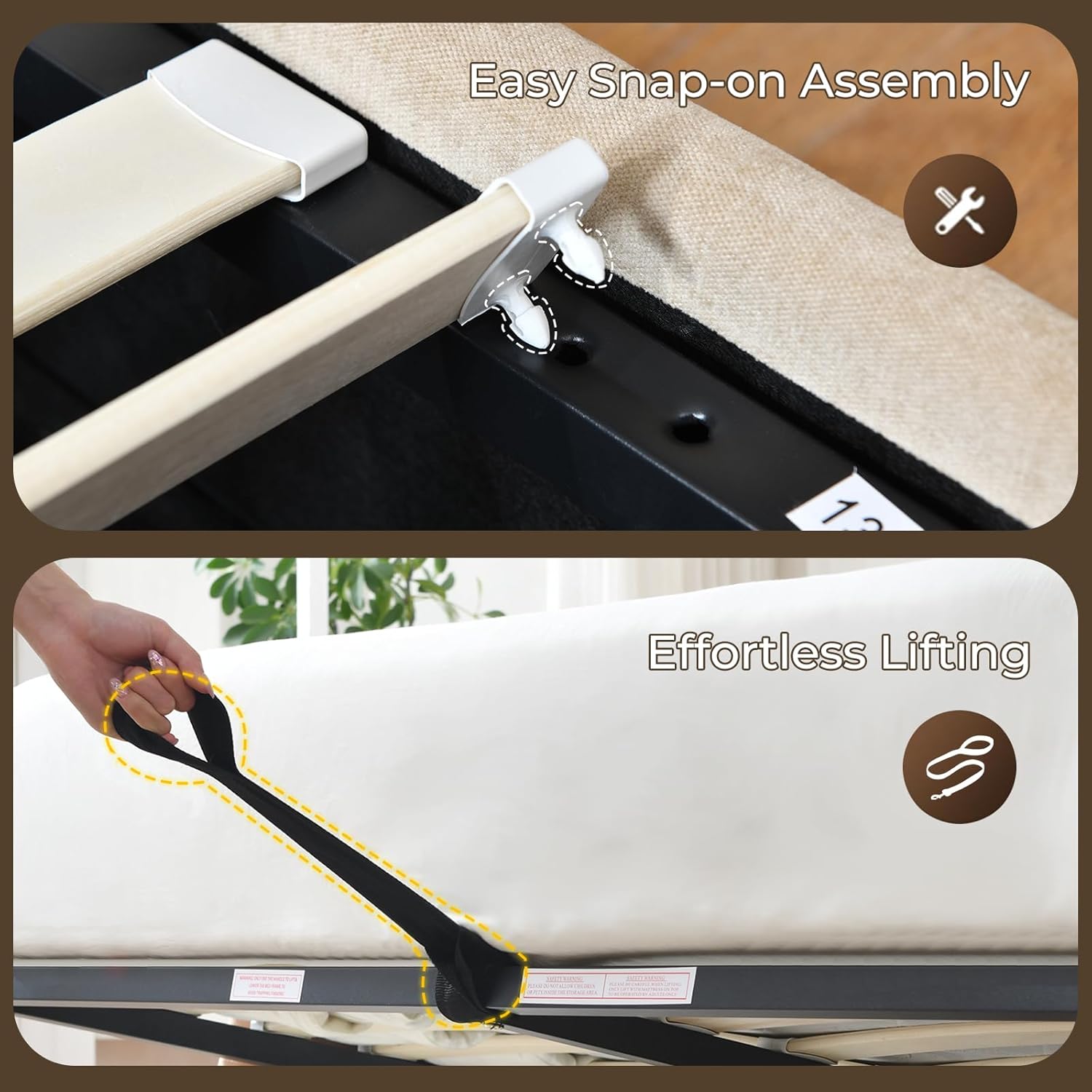 - Effortless Hydraulic Lift System: Equipped with a high-quality hydraulic gas lift mechanism and a sturdy pull strap, this lift up storage bed full allows smooth, controlled lifting for easy access to your stored items without heavy lifting or strain.