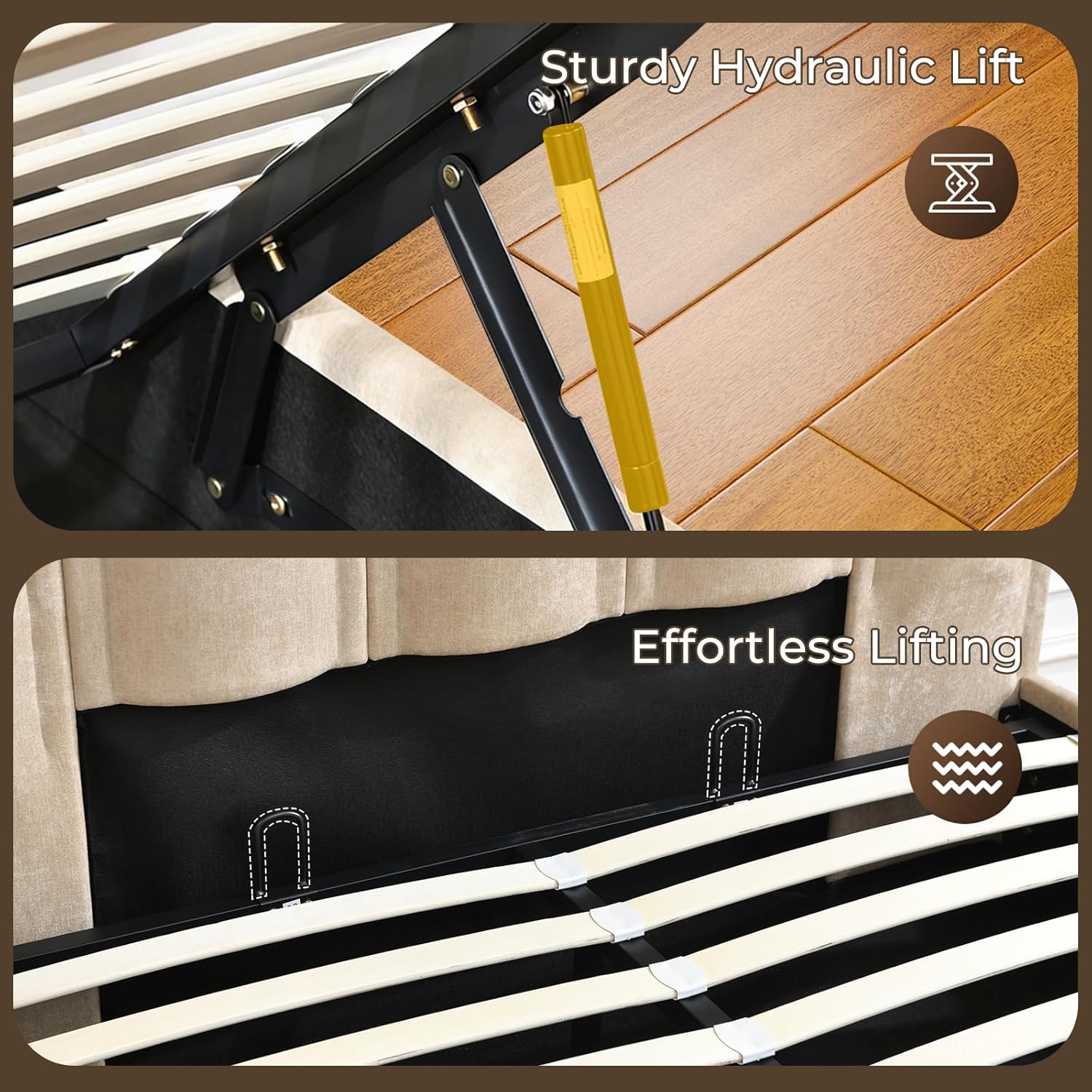 Lift Up Storage Bed, Upholstered Platform Bed Frame with Storage Underneath, 51.6'' Tall Vertical Channel Tufted Headboard, Linen-Textured, Hydraulic Support, No Box Spring Needed, Beige